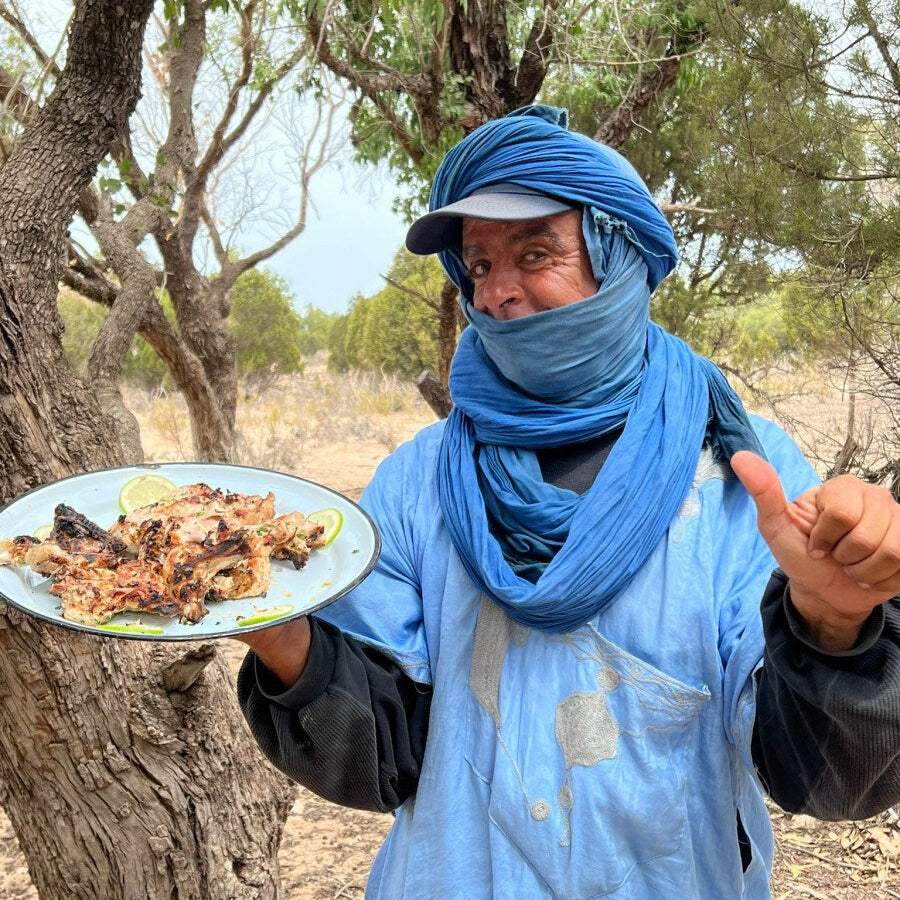 Das vegetarische Menü umfasst: einen abwechslungsreichen Salat, Zaalouk (eine marokkanische Auberginen-Vorspeise), Zucchini-Bällchen, Brot, Wasser und Erfrischungsgetränke sowie frisch über einem Holzfeuer aufgebrühten Tee.