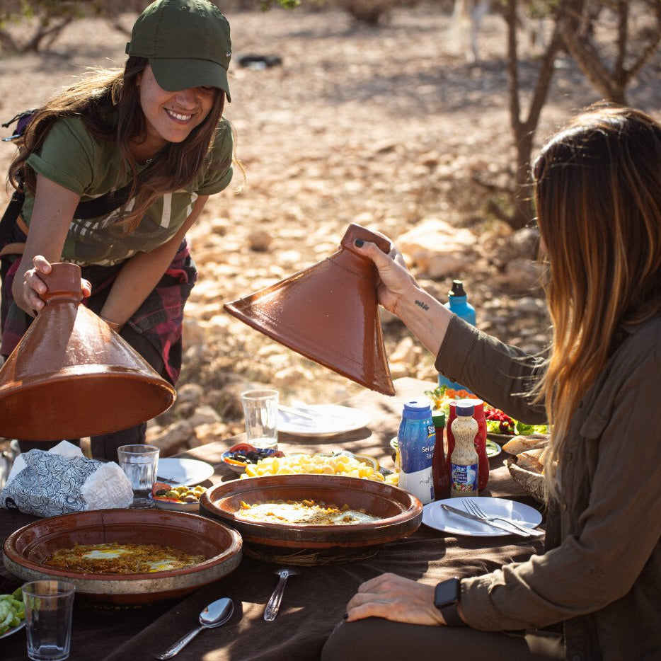 The vegetarian menu, on the other hand, consists of: a varied salad, zaalouk (a Moroccan aubergine-based appetizer), courgette meatballs, bread, water and soft drinks, and tea prepared freshly over a wood fire.